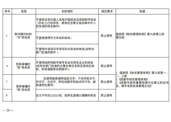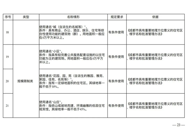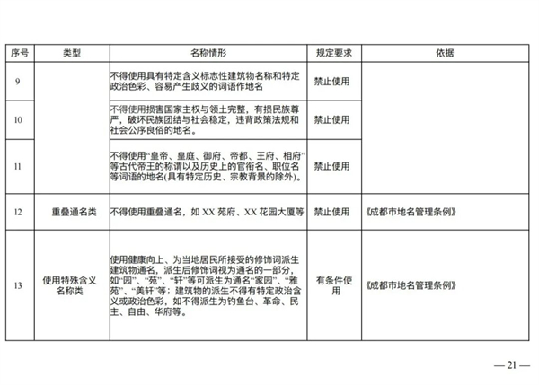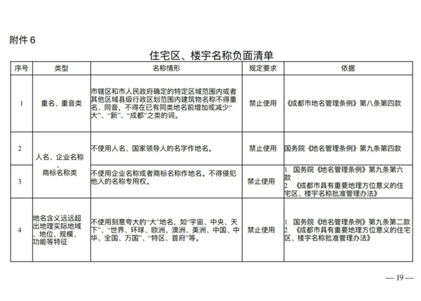 避免重名同音:规定在市辖区、市政府确定的特定区域或其他县级行政区划范围内,住宅区、楼宇名称不得重名、同音,并禁止通过简单增减“大”、“新”、“成都”等字词制造名称混淆。