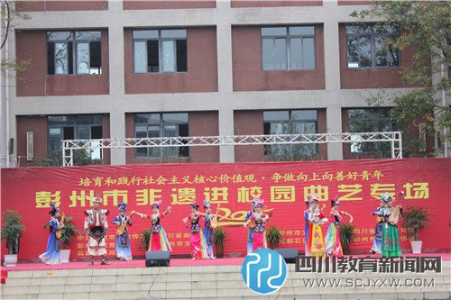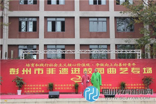四川教育新闻网成都12月11日讯(周佳 通讯员 李忠强)12月9日下午15:00,由彭州市委宣传部、四川省曲艺家协会、彭州市教育局、彭州市文明办、共青团彭州市委主办,彭州市文联、四川省曲艺研究院、彭州市曲艺家协会、成都石化工业学校承办的“培育和践行社会主义核心价值观,争做向上向善好青年——彭州市非遗进校园”曲艺专场巡演第六场,在成都石化工业学校北校区运动场举行,精彩的传统曲艺表演,让学校师生大饱耳福。彭州市文联领导、学校师生共2000余人观看了昨晚的演出。