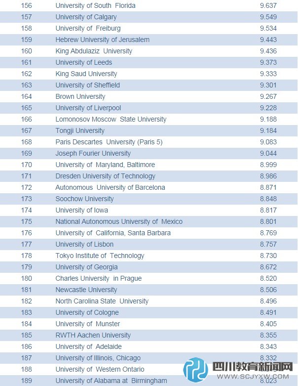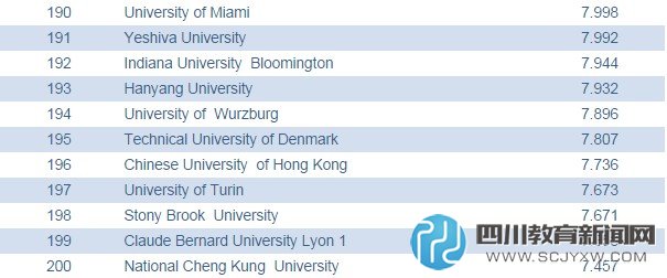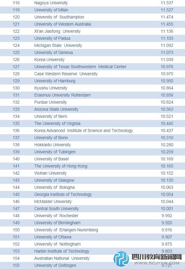 具体排名中,清华大学位列第13名,北京大学位列第22名,浙江大学位列第26名,上海交通大学位列第31名,中国科学院大学位列第46名,复旦大学位列第56名,南京大学位列第77名,中山大学位列第80名,四川大学位列第95名。