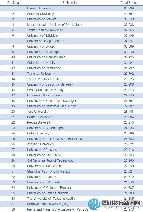 此次排名中,哈佛大学位居全球第一,位列第二名至第十名的大学分别是斯坦福大学、多伦多大学、麻省理工学院、约翰霍普金斯大学、密歇根大学、伦敦大学学院、牛津大学、华盛顿大学、宾夕法尼亚大学。