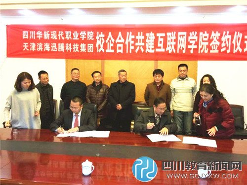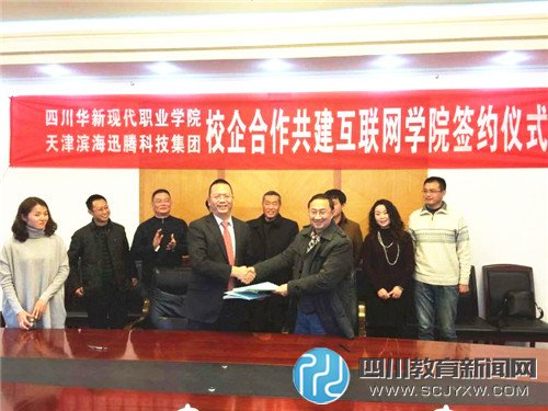签约仪式上,天津滨海迅腾科技集团有限公司董事长邵荣强与四川华新现代职业学院院长杨波签署了校企合作共建“四川华新现代职业学院互联网学院”协议书,至此,四川省高校内“首家互联网学院”宣告成立。