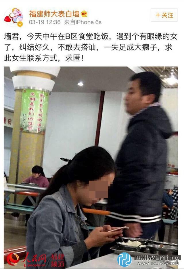 记者在上述微博找到这则刊登于19日中午的信息:“今天中午在B区食堂吃饭,遇到个有眼缘的女了,纠结好久,不敢去搭讪,一失足成大瘸子,求此女生联系方式。”并配有一位女生在食堂就餐玩手机的照片,照片没有加以任何处理。