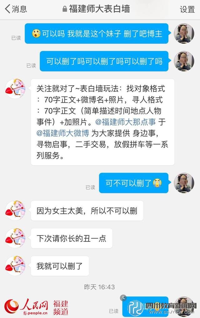 照片被发到网上后,被偷拍的女生在第一时间联系了“福建师大表白墙”博主,希望能删除照片消除影响。不料,博主的回复让其哭笑不得。博主拒绝删除的理由是这样的:因为女主太美,所以不可以删,下次请你长的丑一点,我就可以删除。