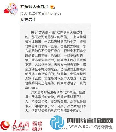 在“福建师大表白墙”微博认证被取消后不久,博主才删除了被偷拍女生的相关图文,另发微博称“我有罪”,博主承认此事对当事人造成了伤害,表示道歉,并自称“微博上的照片都是博主自己偷拍的”,也请求网友停止对福建师范大学的言语“攻击”。尽管如此,大量网友仍在其微博下继续展开讨论,截至晚9点,“我有罪”博文评论数量已超13000条。