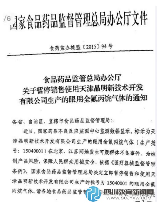2015年7月8号,国家食品药品监管总局办公厅曾向全国发出《关于暂停销售使用天津晶明新技术开发有限公司生产的眼用全氟丙烷气体的通知》,要求立即暂停销售和使用该公司生产的批号为15040001的眼用全氟丙烷气体。