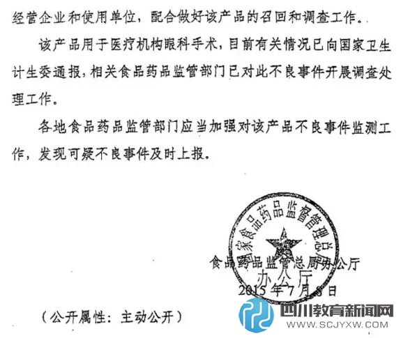 7月6日,我局向全市发出《关于暂停使用天津晶明新技术开发有限公司生产的“眼用全氟丙烷气体”的紧急通知》,要求立即暂停使用天津晶明新技术开发有限公司生产的“眼用全氟丙烷气体”产品。后国家总局向全国发出《关于暂停销售使用天津晶明新技术开发有限公司生产的眼用全氟丙烷气体的通知》,要求立即停用该批产品。