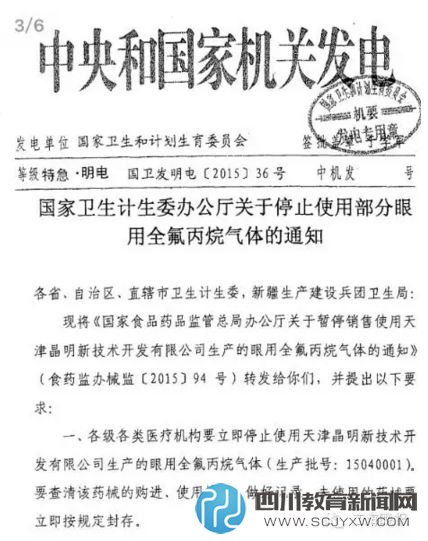 2015年7月9日,国家卫计委也发出了相关通知,要求停止使用部分眼用全氟丙烷气体。