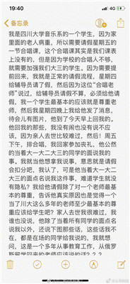 19日网友爆料,四川大学声乐系学生因家人去世向老师请假被拒绝,该老师表示:“你可以回去,但我要扣分。”随后,该老师在全年级合唱课上公开拿该生隐私做例,并表示:“如果这学期你家里面有四个人去世,我这门课,你只能重修”。@四川大学了解情况后连夜调查,要求涉事教师向学生道歉并且后续澄清,取得了当事人的谅解。