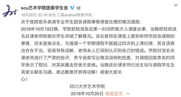 2018年10月19日晚,学院获知消息后第一时间积极介入调查此事,当晚即找到该名任课老师和相关学生详细了解情况。该名教师在课堂上提到有同学因丧请假的事情,但未直接点名,为强调一个学期请假不能超过四次的上课纪律,其言语表达存在不当,容易导致误解,老师本人已深刻认识到自己的错误。学院对该名任课老师进行了严肃的批评,责令连夜写出情况说明和检查,对请假回家奔丧的同学表示了慰问,对其亲属去世表示哀悼。当晚该任课老师已经主动与请假学生及其家长联系沟通、表达歉意并获得谅解!谢谢大家关心!