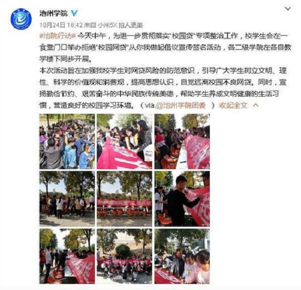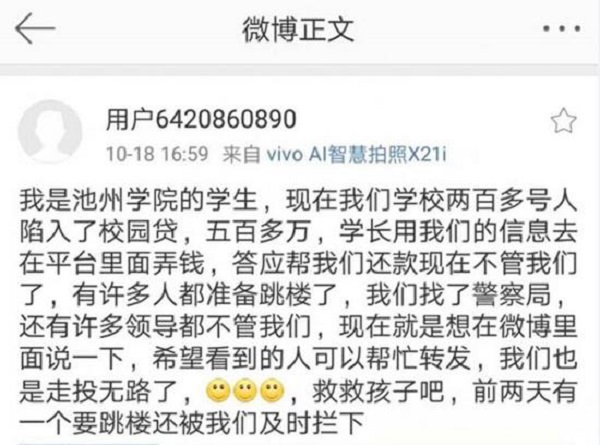 10月25日,现代快报记者通过调查得知,通报中的高校为池州学院。该学院早于警方通报,于24日16点在其官方微博发博了一则关于“校园贷专项整治工作”的活动通知。而在此之前,已有多名该校学生在网上发帖求助,一位自称池州学院的学生匿名在微博上求助称:“现在我们学校两百多号人陷入了校园贷,五百多万,学长用我们的信息去在平台里面弄钱,答应帮我们还款现在不管了……”