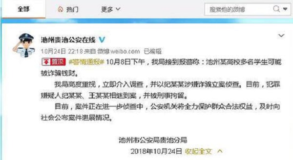 10月24日晚22点,安徽省池州市公安局贵池分局在官方微博发布了警情通告:“10月8日下午,我局接到报警称:池州某高校多名学生可能被诈骗钱财。我局高度重视,立即介入调查,并以纪某某涉嫌诈骗立案侦查。目前,犯罪嫌疑人纪某某、王某某相继到案,并被刑事拘留。”