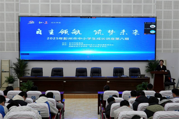 11月20日,由彭州市教育局主办,彭州市南部新城学校区片中心、成都石化工业学校(彭州市技工学校)联合承办的“自主领航·筑梦未来”主题生涯规划讲座顺利举行。本次讲座聚焦青少年生涯规划核心议题,特邀专家刘立频老师担任主讲嘉宾,吸引了教育系统教师代表、家长代表及学生代表共百余人现场参与。