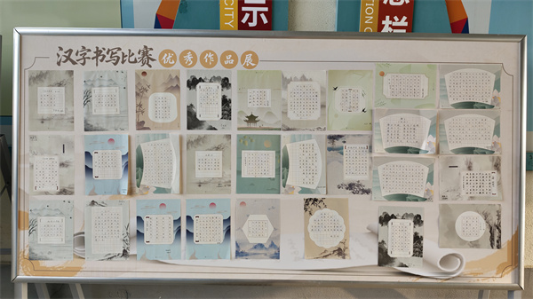 学校将优秀作品精心制作成主题展板,在校园公共区域集中展示。一幅幅字迹工整、意蕴深远的作品吸引了大批学生驻足围观、交流学习,现场反响热烈。同学们在欣赏佳作的同时,不仅感受到书写艺术的魅力,更激发了对文化学习的浓厚兴趣,形成了“比学赶超”的良好校园氛围。
