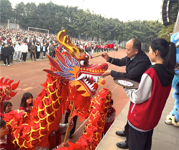 致辞环节后,一场别开生面的传统文化盛宴将典礼推向了高潮。在余治平为新学期敲响进军鼓的同时,舞狮表演火热登场。两只威武雄壮的“狮子”率先登场。它们时而摇头摆尾,时而腾挪跳跃,动作灵活,神态逼真,精彩的表演赢得了师生们的阵阵喝彩,寓意着吉祥如意、生机勃勃。醒狮腾跃、灵动威武,祥龙献瑞,余治平为祥龙执笔点睛,寓意新学期龙行龘龘、前程似锦,为典礼增添浓厚喜庆氛围。