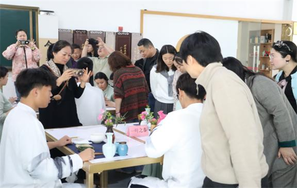在课堂展示环节,心理、旅游、艺术三位老师协同授课,呈现了一堂以茶韵为媒、美育为桥、心育为核的沉浸式综合审美大课。