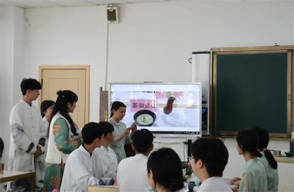 黄英聚焦旅游茶艺专业,细致讲解宋代点茶流程、茶百戏创作技艺,带领学生感受茶道礼仪与中华茶文化底蕴。