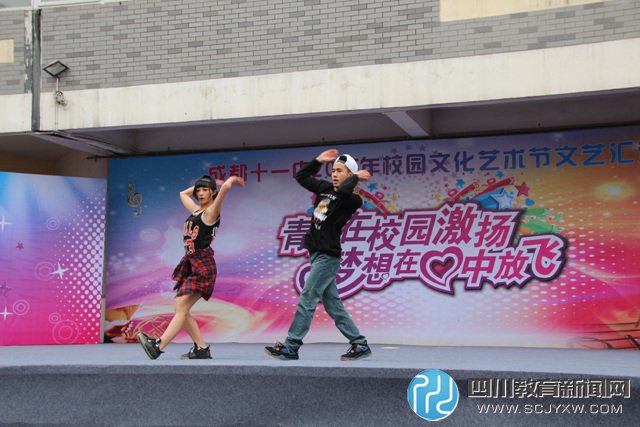 四川教育新闻网成都12月25日讯(陈海燕 宁霞娟) 一年一度的成都十一中校园文化艺术节文艺汇演于12月24日在学校操场隆重举行。 成都十一中历来重视打造学校浓厚的艺术氛围,培养学生在艺术方面的兴趣与爱好,促进学生全面、健康的发展。每年的年末,学校都会组织长达一个月的举行校园文化艺术节,在各年级中开展各项文艺比赛,并推选出优秀节目在文艺汇演中参演。同时,学校还积极配合社区等友邻单位开展丰富多彩的文艺活动,为创建和谐社区做出了应有的贡献。此次由十一中主办,双眼进小学、鼓楼小学、红光小学、新华路小学、玉沙路社区和成都军区78086部队协办的迎新文艺汇演,就是整合了社区及友邻单位的集体智慧与力量,共同推出的一台展示共建精神文明的文艺演出。