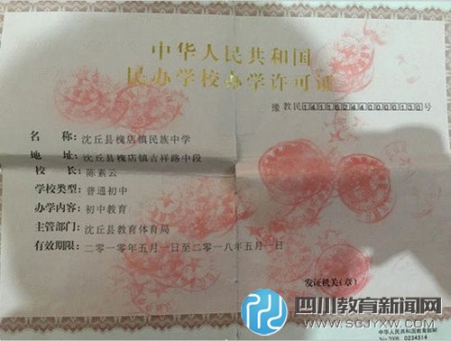 沈丘县槐店镇民族中学办学许可证。 两违办公室:租用农田建学校本身就不合法 对此,沈丘县两违办公室主任范欣胜告诉记者,民族学校非法占用基本农田二十多亩建学校,属违法办学。 范欣胜表示,一开始民族学校租用别人的场地来办学,后来别人不让租了,就租用农田建房。“国家基本农田不准占用,他用来建宿舍,违反土地法、规划法。” 不光是宿舍与食堂,范欣胜认为民族中学教学楼也属违法占地建造,“但当时没管,2015年他们强行修建(宿舍与食堂),我们就强制拆除,我们也给教育部门通报了,说他没有办学场地,不具备办学资格。” 对于民族学校非法占地办学的情况,沈丘县土管局分管东城区的东队长也予以了证实。他告诉澎湃新闻,2013年民族学校盖教学楼时土管局曾因其违法占地罚款过一万元,“罚款过后也不允许他们建,但我们没拆除权,只有政府有拆除权。” 不过,对于租地办学的合法性,沈丘县教育局主管民办教育的王治国主任又有另一种说法。他表示,当时允许租赁土地办学,好多学校都是这样做的。 此外,王治国表示,去年民族学校私自修建宿舍和餐厅,没有向教育局书面申请,“只是跟我们口头说过,我们也从未在学校建设期间去审查过。” 教育局安全办崔主任4月21日对澎湃新闻称,民族中学本来办学地址在槐店镇辖区,后来没有给东城区办事处说明申请,就跑到东城区办学,目前学校在东城区的办学是违法占地,其实是一个不合格的办学机构,“民办学校是教育局社会力量办学中心那边审批的,他们从来没跟我们打过招呼,我们只是加强监管。”此外,崔主任承认,他曾在民族学校建宿舍食堂过程中去现场看过。