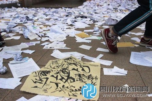 在教学楼前将废旧试卷和书页洒下,并高声呐喊“高考加油”,缓解压力。
