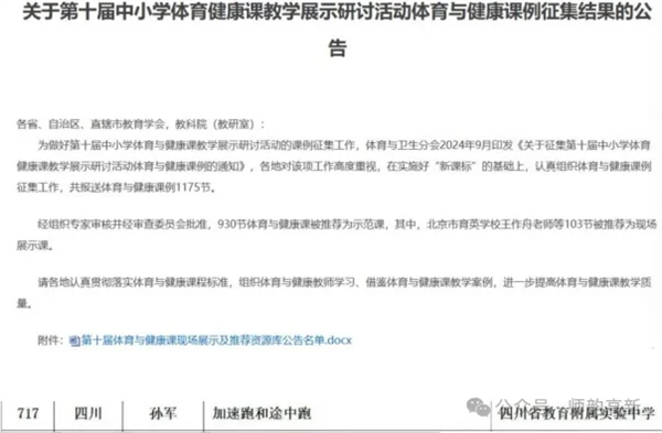 在第十届中小学体育与健康课教学展示研讨活动中,省教科院附中体育学科孙军老师的课例《加速跑和途中跑》被评为全国示范课,教学视频与教案成功入选中国教育学会资源库,成为全国体育教学的标杆样本!