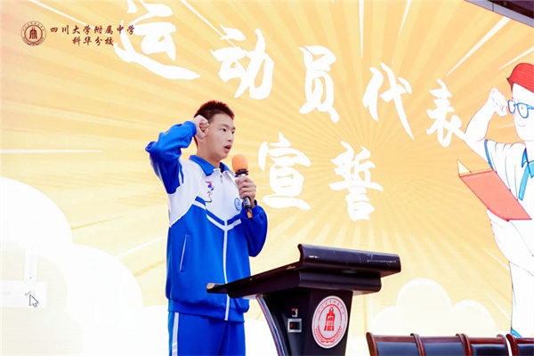 川大附中科华分校副校长王源为开幕式致辞。她鼓励同学们在运动中锤炼意志、增强体魄,发扬“友谊第一,比赛第二”的体育精神,并预祝运动会圆满成功。