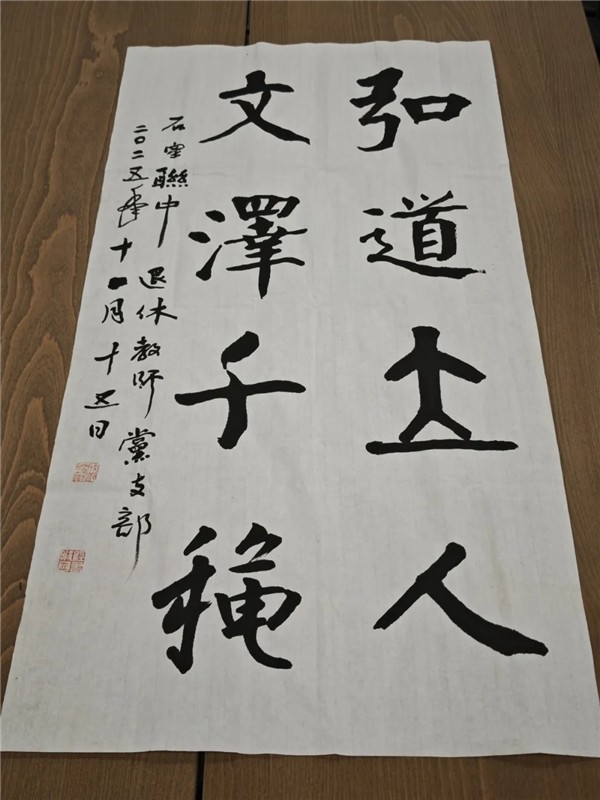 本次来访的退休党员中,年纪最长的曾祥芝老师,今年已84岁高龄。王建中老师因病未能参与访校,特手书“弘道立人 文泽千秋”匾额,代表退休党支部赠予学校。