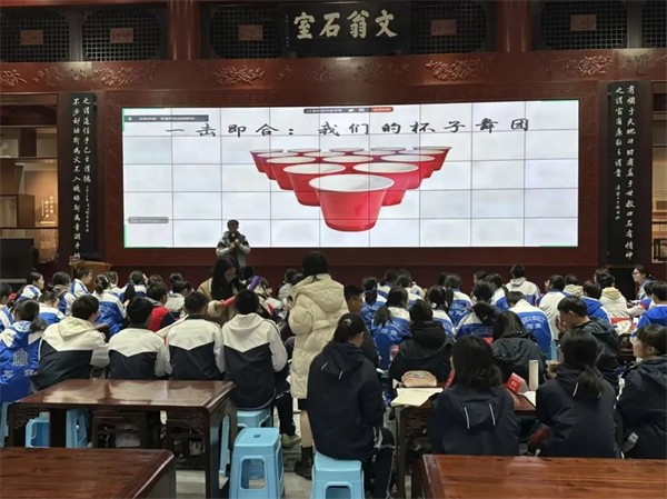 同学们与石室中学高2027届1班学生共同参与邱祥迪老师的主题班会课,通过“杯子舞”表演训练,在节奏中锻炼手眼协调能力,在团队合作中提升英语感知与协作意识,实现“趣中学、学中悟”的融合育人效果。