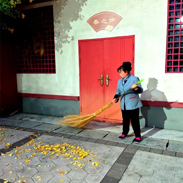 巷道两边的路灯还未熄灭,保洁阿姨手中的扫帚已奏响了红旗校园里的第一支晨曲。她们细致地清扫着校园,不落下任何一个角落,利索的指间带走了每一片落叶。没有豪言壮语,只有辛勤劳作后汗迹未干的淳朴笑脸;没有惊天动地,却用双手抹去了整个校园里的尘埃。正是这些忙碌的身影,成为了红旗校园里美丽的风景线。