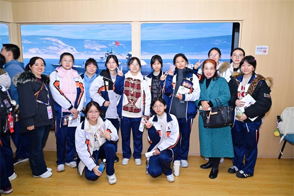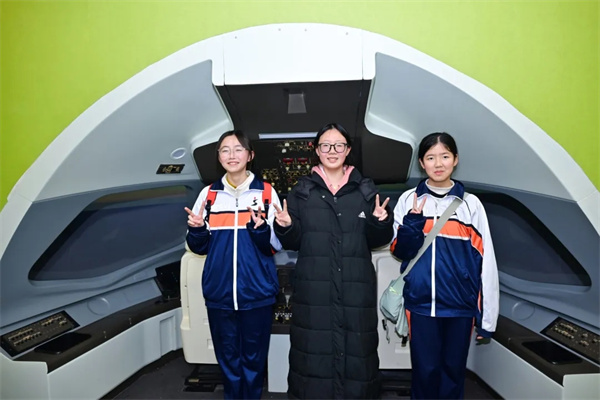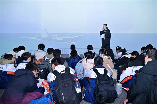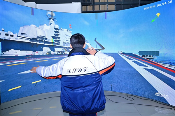 此次研学以“科技新发现 智领新时代”为主题,场馆充分利用国家国防重点实验室与高校科研资源,打造沉浸式科技体验空间。学子们先后体验了中国空间站模拟、C919大飞机驾驶、复兴号高铁操控等12个特色项目。在辽宁舰战机着舰体验中,同学们以第一视角感受歼-15着舰的震撼瞬间,深刻感受到祖国军事力量的强大;在万吨大驱模拟舱内,研学导师细致讲解舰载武器系统,让同学们对我国自主研发的信息化作战技术有了直观而深入的了解。