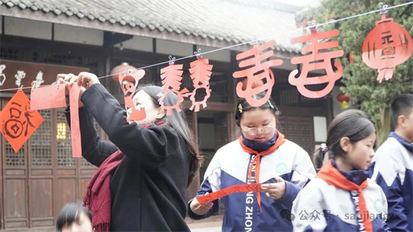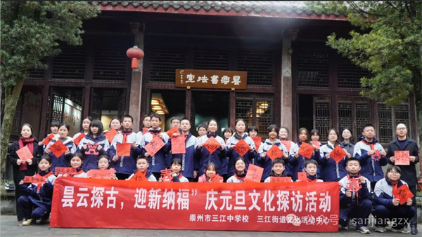 为深化校园文化与地方文旅融合,滋养青少年对本土文化遗产的认同与热爱,2025年12月24日,三江街道文化活动中心与崇州市三江中学校携手开展“昙云探古,迎新纳福”主题文化实践活动。三江中学副校长赖环、文旅管家陈琼,以及文旅志愿者和30名学生干部代表参与此次活动。