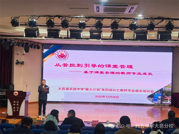 为助力教师专业提升,优化课堂管理实效,2025年12月26日上午,大邑县实验中学在学术厅顺利开展了主题为“从管控到引导的课堂管理”的教师专业成长专题培训。大邑县实验中学校长宋仕平、副校长任冠强、师培中心主任贾登位,全体班主任及35岁以下青年教师参加了此次活动。活动由教务处副主任万红霞主持。