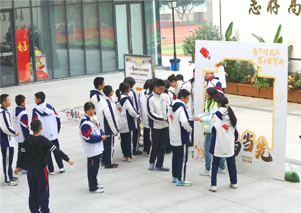 照壁前,多社团联合创作的大型“龙”形装置气势恢宏,线条流畅、层次分明,龙与马元素交相辉映,诠释“龙马精神”的刚健进取。这里是创意实践的舞台,学生自主设计校园文化探秘互动,在品味学校内涵、解读学校文化中,爱校情感漫延伸展。