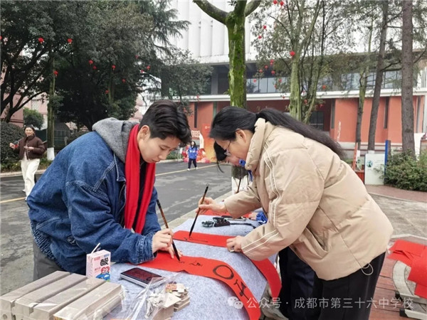 在墨香萦绕的书法台前,同学们执笔挥毫,认真写下“福”字、春联或个人心愿。不少老师也驻足于此,或亲笔写下对学校发展的祝福,或为同学们的书法作品点赞点评,偶尔还会与学生切磋笔法,共享笔墨之乐。