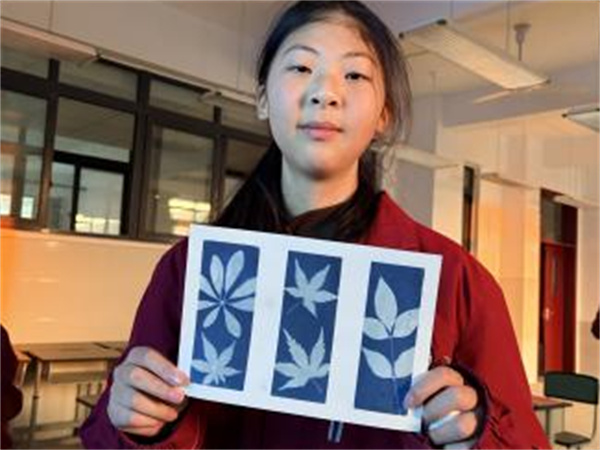 同学们将覆盖好底片的感光纸置于阳光下,开启耐心的等待之旅。随着光影流转,未被遮挡的区域在阳光照射下悄然发生化学反应,图案轮廓逐渐浮现。深邃的蓝色与纯净的白色形成强烈对比,每一幅作品都独一无二、充满惊喜。(张红 通讯员 曾凡)