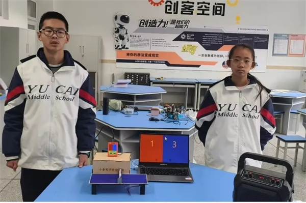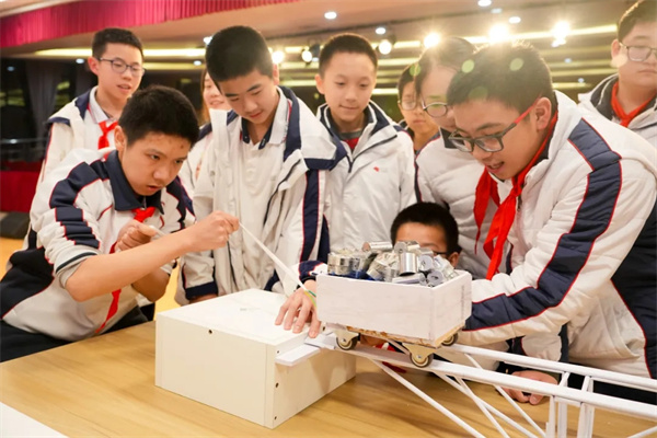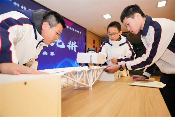 校园内,各类实践活动成为学子锤炼创新能力的“练兵场”。班级智慧大比拼中,初一年级木筷承重、初二年级纸桥过车,学子们仅凭简单材料搭建挑战极限的结构,在“设计-测试-迭代-优化”的完整工程闭环中,将物理、数学原理转化为解决问题的实际能力;初三分子模型制作、AI智能标签设计等活动,进一步推动跨学科知识融合,展现了“未来工程师”的潜质。