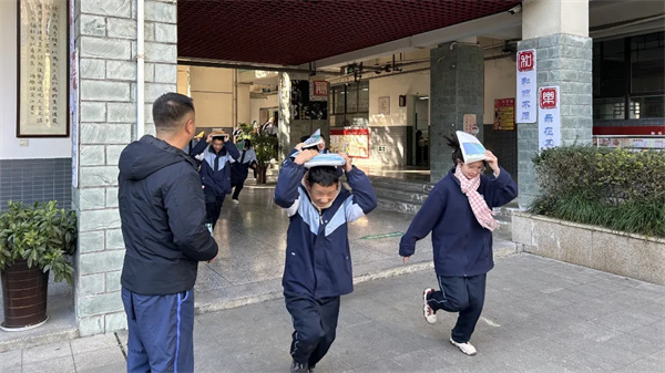 下午15时50分,随着第一声“地震警报”响起,演练正式开始。上课师生迅速反应,立即采取紧急避震措施,就近蹲在课桌旁或墙角,用书本护住头部。约一分钟后,“疏散警报”响起,全体学生在班主任和楼层指挥老师的引导下,弯腰低身、以书掩头,沿预定疏散路线快速、有序地向操场安全区域撤离。整个疏散过程紧张而有序,全校师生均在规定时间内安全到达指定集结位置。