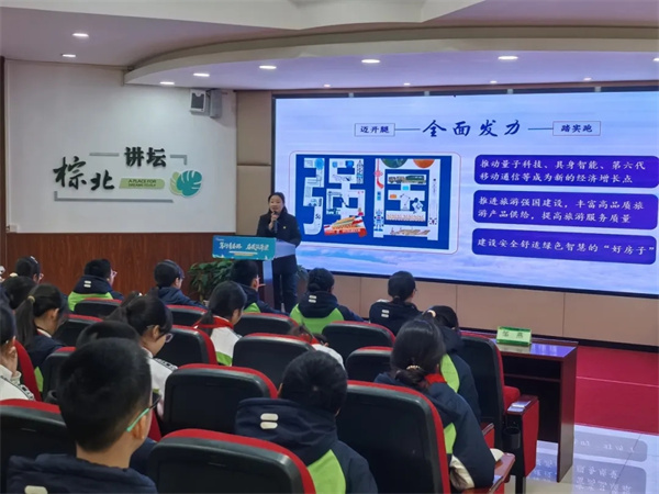 随后,成都市棕北中学党委副书记、执行校长邹燕为全体学生会成员带来了题为《在奋斗中,美好的心愿接连实现》的思政课分享。邹燕结合百年中国心愿的实现历程,用快递业发展、育儿补贴发放等民生实例,福建舰、“夸父”大科学装置等科技成就,以及体育健儿的拼搏故事,生动展现了我国在发展中取得的辉煌成果。