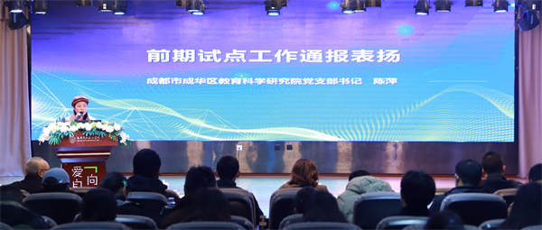 成都市成华区教育科学研究院党支部书记陈萍对试点工作中涌现出的先进个人与集体进行了表彰。入选国家级活动的创新课例获奖者代表与应用数据先进教师登上领奖台。