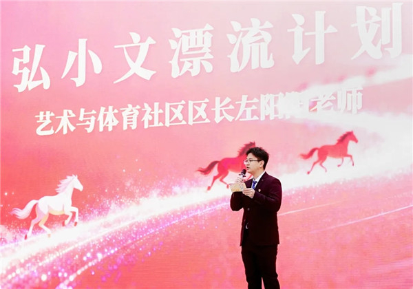 典礼上,校园文化形象“弘小文”首次动态亮相,万子菡同学作为设计者,生动讲解了其设计理念。随后,艺体社区区长左阳阳老师宣布“弘小文漂流漫画”活动正式启动。这个可爱又富有内涵的形象,将成为记录校园故事、凝聚情感认同的文化符号,让校园文化如潮水般流动、生长。