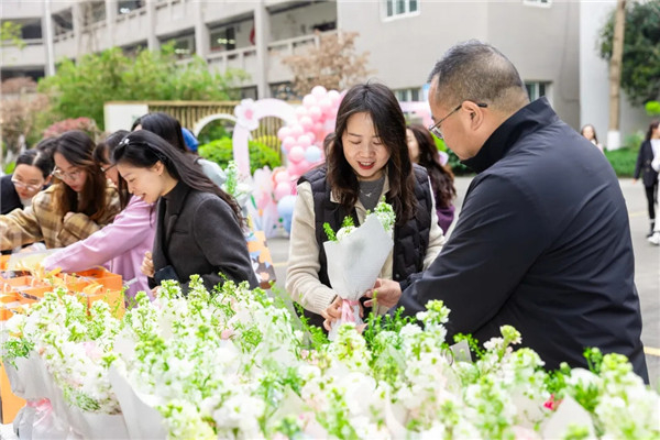 校党委书记方宏,党委副书记、校长吴杰携全体男行政和工会委员,亲手将娇艳的鲜花与精致的礼品,送到每一位女教职工手中。