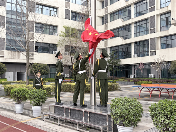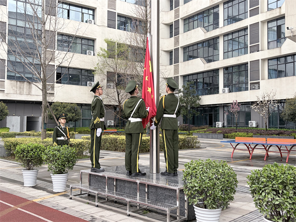 迎着和煦春光,国旗班同学迈着铿锵有力的步伐,护卫五星红旗昂首入场,全体师生肃立致敬。雄壮的国歌声中,五星红旗冉冉升起,赤诚的爱国情怀在校园中久久激荡。