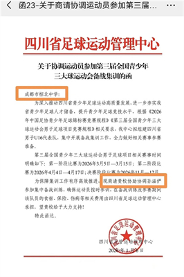 近日,捷报再传:孙涵俨同学正式被借调加入四川足球U16队伍,将代表四川备战第三届全国青少年三大球运动会。此次赛事增设男足U16组,其成绩将纳入第十六届全运会总成绩册,是检验青少年足球人才培养成果的重要舞台。孙涵俨的入选,不仅是对其个人能力的高度认可,更是全国校园足球建设成果的又一有力印证。