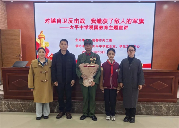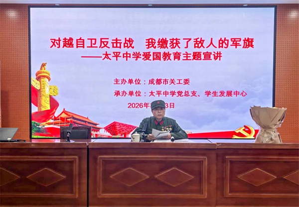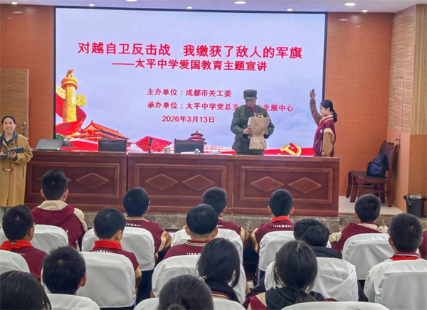 2026年3月13日下午,四川天府新区太平中学七、八年级全体同学齐聚文乾礼堂,特邀对越自卫反击战英雄史利坤爷爷开展爱国主义主题宣讲,重温烽火岁月,厚植家国情怀。