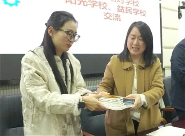 随后,郫都四中李副校长、徐副校长分别为益民学校和阳光学校赠送学科帮扶资料。益民学校的蒋校长、阳光学校的边书记分别作了讲话。