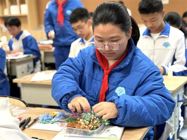 当同学们知道了花的故事、诵出了花的诗意,生物课堂将这份对花的感知延伸到了指尖。植物拓染活动中,大家俯身捡拾春日的落叶与花瓣,以敲拓为笔、以方巾为卷,将草木的鲜活脉络与自然色彩永久定格。每一次轻敲慢拓,都是与自然的对话;每一幅拓印作品,都是对花之生命的另一种延续。干花书签的制作,则让春日芳华封存于纸间,让自然之美伴随书香流转。