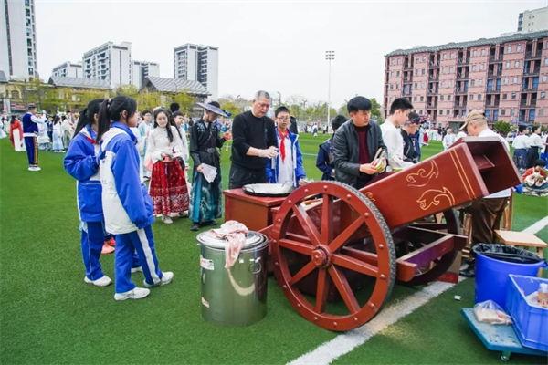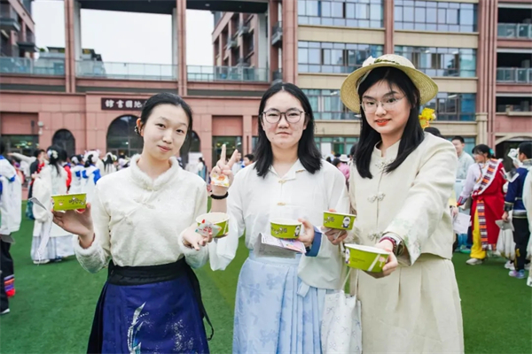 花朝雅集,乐趣无穷。校园化身为繁华的春日市集。各个摊位前人头攒动,不仅有投壶、射箭等传统游戏,更有让人垂涎欲滴的非遗小吃。当软糯香甜的棉花糖在舌尖融化,当糖画艺人勾勒出栩栩如生的花鸟鱼虫,非遗文化的烟火气便在这一刻深入人心。