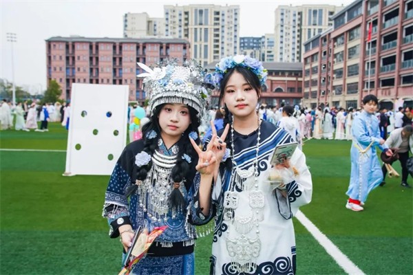 花簪云鬓,衣承礼韵。活动当天,初一初二同学分别身着汉服、传统民族服饰,高中年级的同学则是穿上了雅致的新中式服装。大家鬓边簪花,衣袂飘飘,行走在校园中,仿佛穿越回了那个风雅的年代。同学们不仅装扮了七中墨池的春天,也成为了春天里最亮丽的风景。