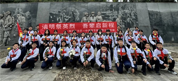 随后,全体师生在烈士纪念碑前庄严宣誓,铮铮誓言铿锵有力,彰显出东升一中学子勇担时代使命的责任担当。宣誓结束,师生代表缓步走向纪念碑,敬献花圈与白色菊花,寄托对先烈的无限哀思。