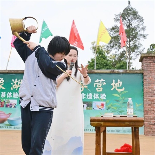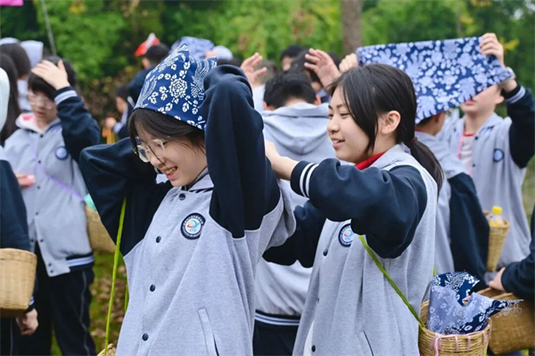 石象湖茶园,初一年级学子开启“一缕春茶香”的文化探寻。同学们头戴方巾、手挎茶篓,在茶农老师指导下精挑细采鲜叶;亲手掌勺翻炒中,感受茶叶在指尖从青绿到醇香的奇妙蜕变;观摩茶艺表演,体悟“和敬清寂”的茶道精神浸润心灵;同心鼓拓展更凝聚团队默契。此次研学以茶为媒,将传统文化教育与审美教育深度融合,让学生在采、炒、品的全流程体验中感悟中华优秀传统文化精髓,涵养审美素养与文化自信,实现智育与美育的协同育人目标。