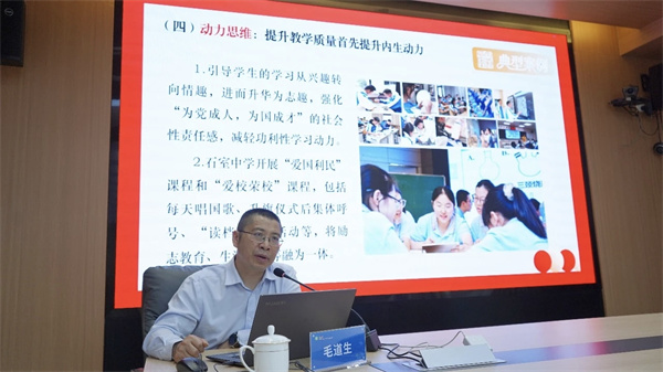 随后,毛道生书记以《提升教学质量的思路与行动》为主题,以系统、累积、素养、动力四大思维锚定提质方向,以强化奋斗精神、营造团队文化、厚植教研风气、聚焦课程课堂、提升命题质量、狠抓管理质量、注重分层培养、养成自主学习、夯实良好习惯、做好心理保健十大行动细化落实路径,系统分享了石室中学的办学理念与实践经验。毛书记围绕新时代教育要求,深入剖析学校管理痛点难点,分享科学高效的管理方法与实践策略,引导参训干部拓宽管理视野、更新管理思维、强化责任担当与服务意识。讲座内容兼具理论高度与实践指导性,语言生动、案例鲜活,为联盟校行政干部提升管理能力、优化办学品质提供了清晰思路与有力支撑。